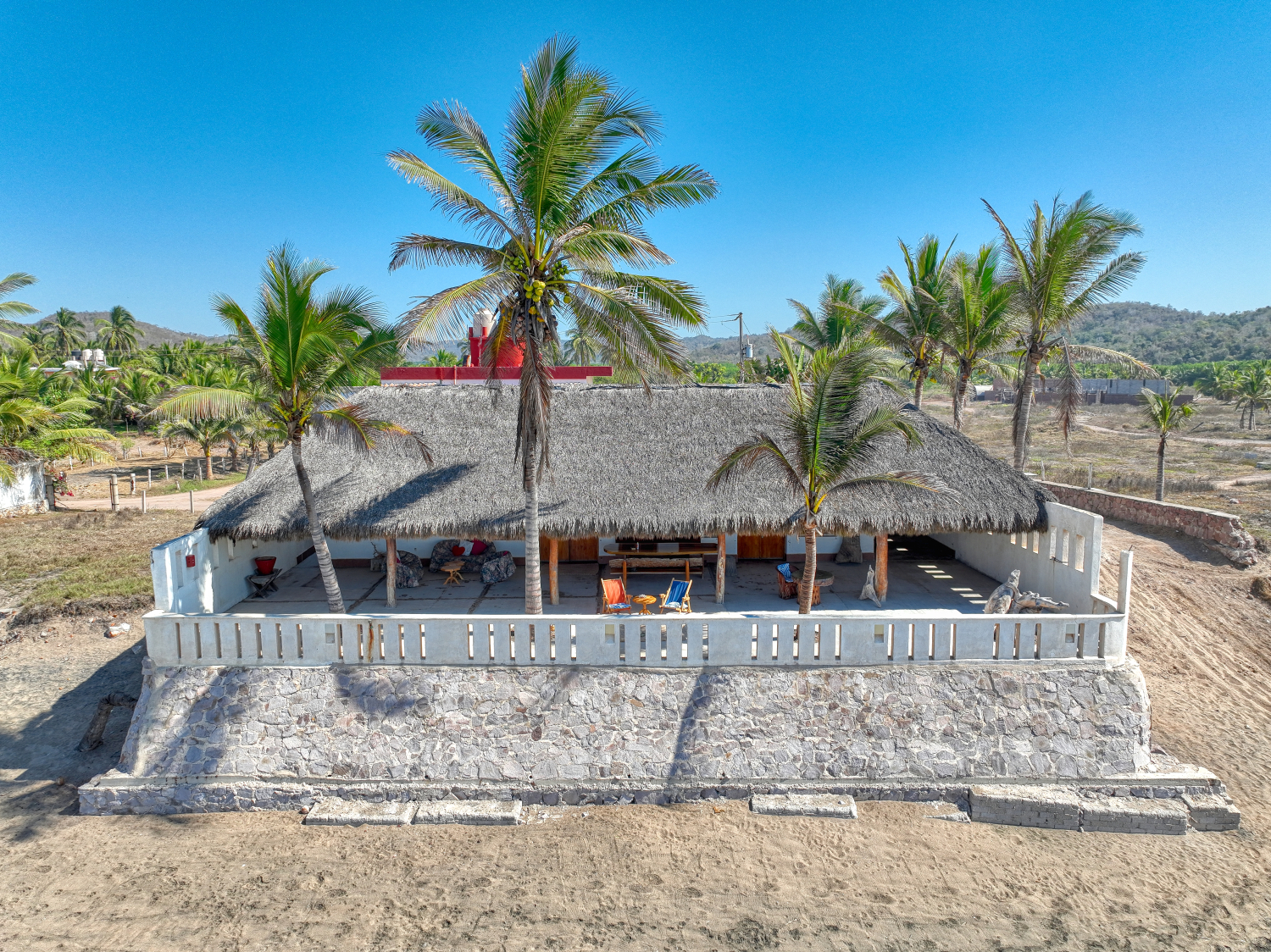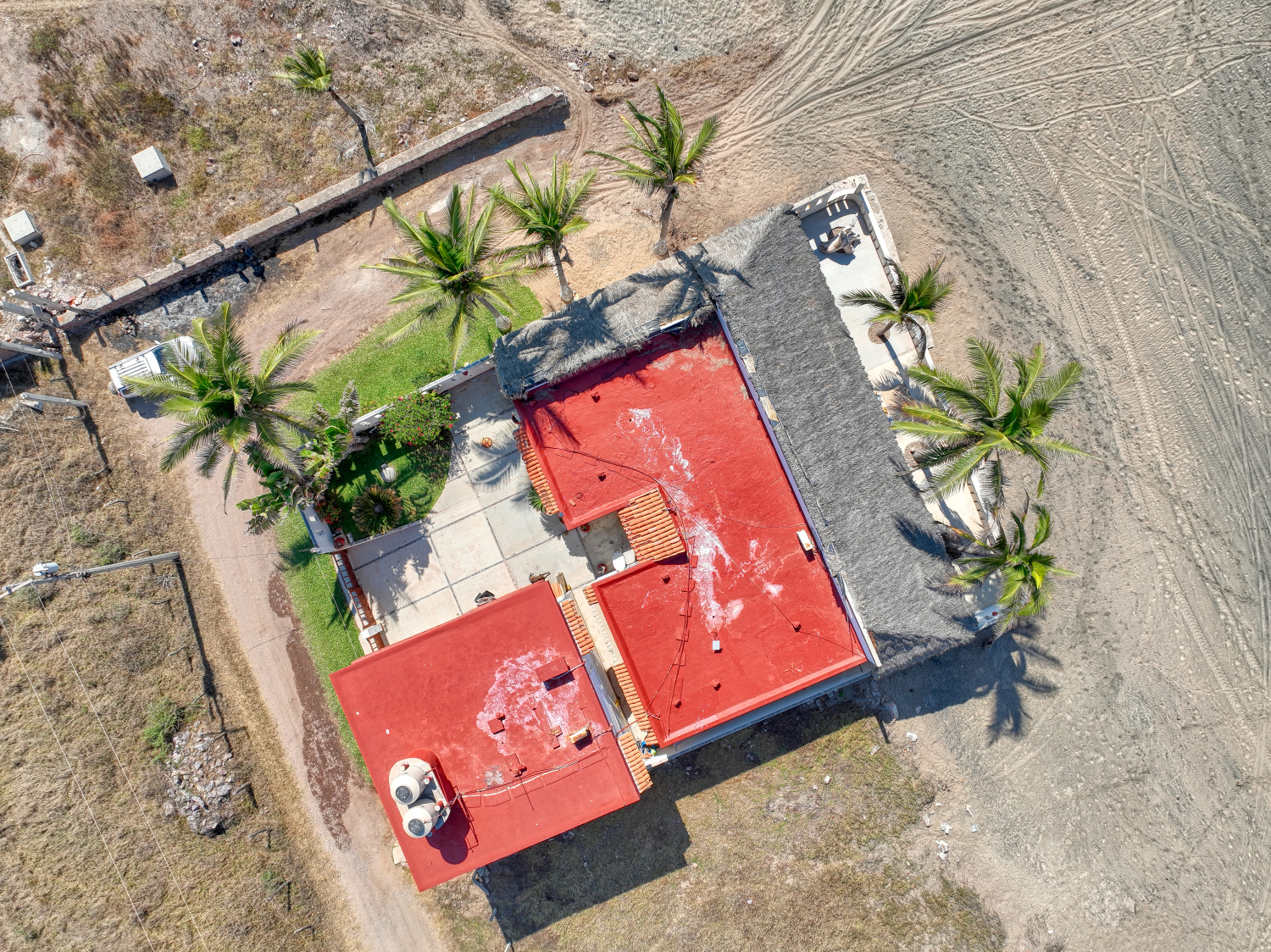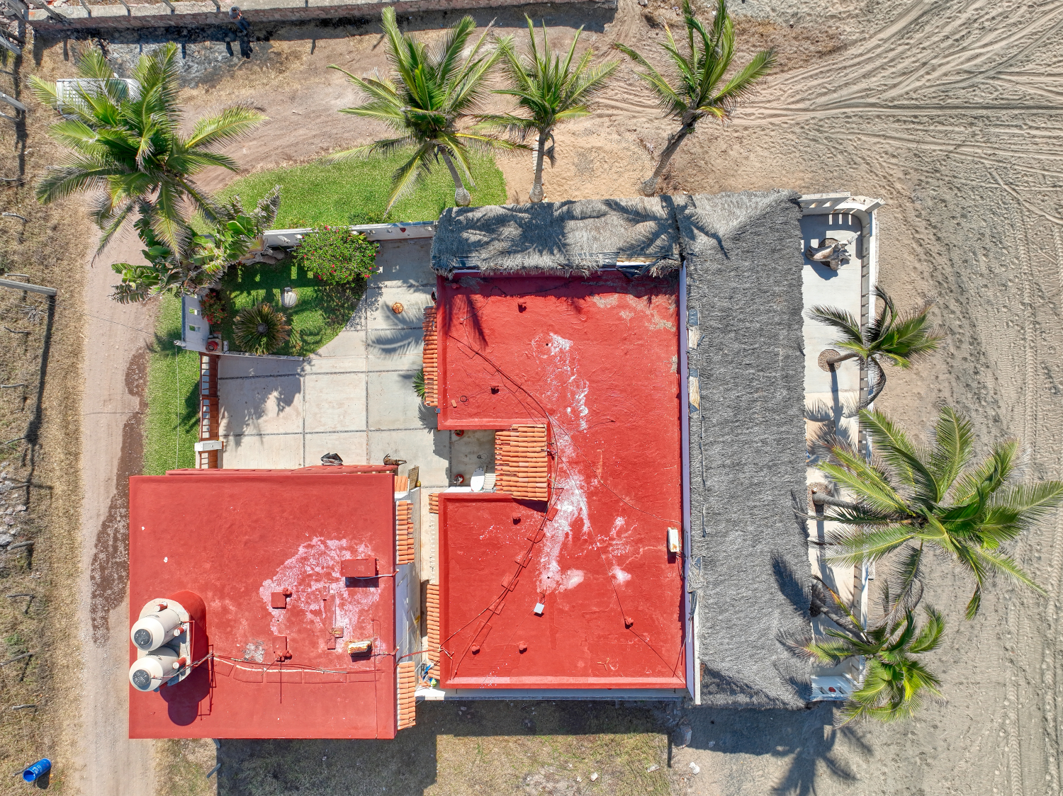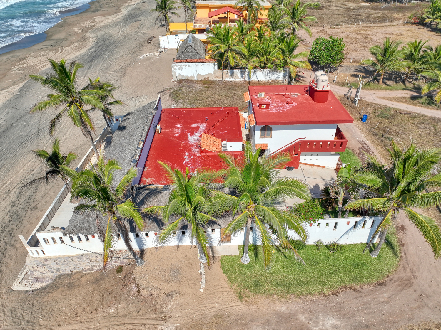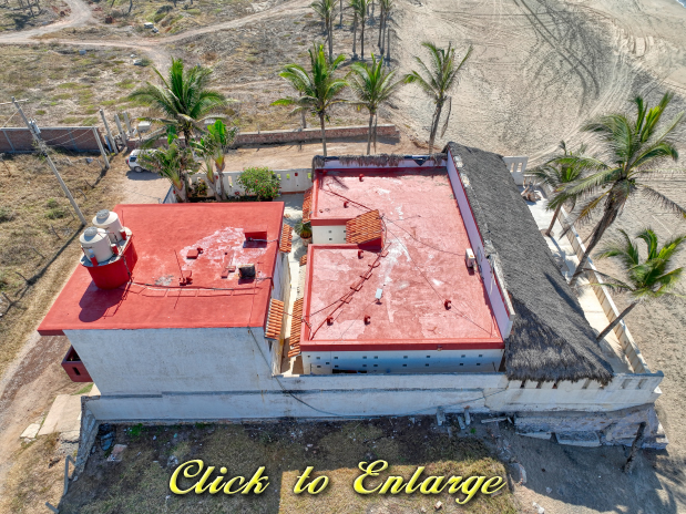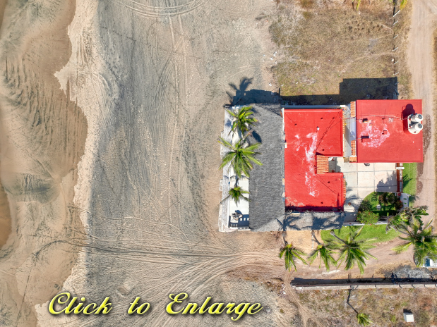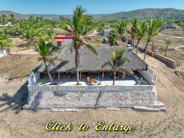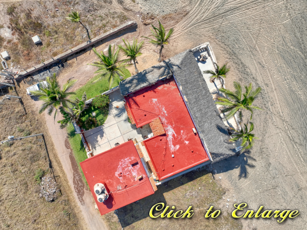 The house sits on 551 m2 of land and consists of two buildings, the first bulding is the main house which is one story and consists of two bedrooms with full bathroom and closet each one, a huge kitchen, dinner area, living room, laundry room, outside full bathroom and a huge palapa terrace in all the oceanfront side; the other bulding is two story and the first floor consist of a big garage with apace to parking two cars and space for storage tings, the second level consist of two bungalows each one with kitchen, dinner area, living room, full bathroom and bedroom; the soutside bungalow has sunrise view and the other has sunset view; there area a small garden in the patio and all the other part of the patio is covered with concrete floor; the property only has one neighbor property because in one front is the beach and the other two are street fronts; at just 10 meters south side of it property start the new resort under developement of El Tecuan property.