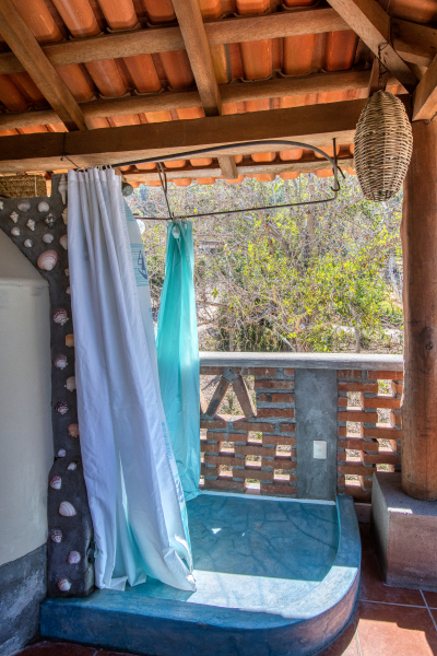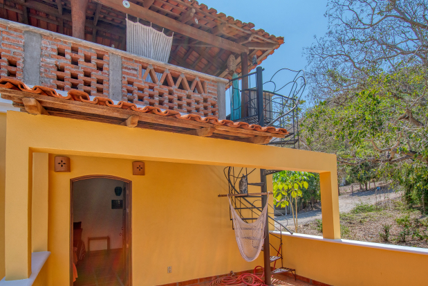 Once up the turquoise studded stairs , you'll enter the studio space , comfortably large enough to house a kingsized bed and a day bed , as well as a few comfortable chairs. Also on the front wall of this space is the kitchen area , looking out and down upon the natural landscape . Here , in the second level is a richly painted orange bathroom , appointed with white and apple green tiles , and also detailed with design tiles . Stepping out another door , the private patio of the second floor awaits you . With plenty of relaxation area , and partially sheltered for a breakfast table , it supports a circular staircase leading up to the private open air terrace above . Playfully treated as a "Glam Camp" style environment , this third floor terrace also has all the bathroom facilities , given privacy by hanging curtains and petates , as well as dimmable lighting , as does the entire house , allowing this terrace in the trees to take on a magical , even romantic quality at night. You'd find that some of your guests would want only to stay here! As well as being a mesmeriaing space at night , here , you can relax and watch all the iguanas , chachalacas , woodpeckers, and palomas that are in the trees throughout the day !