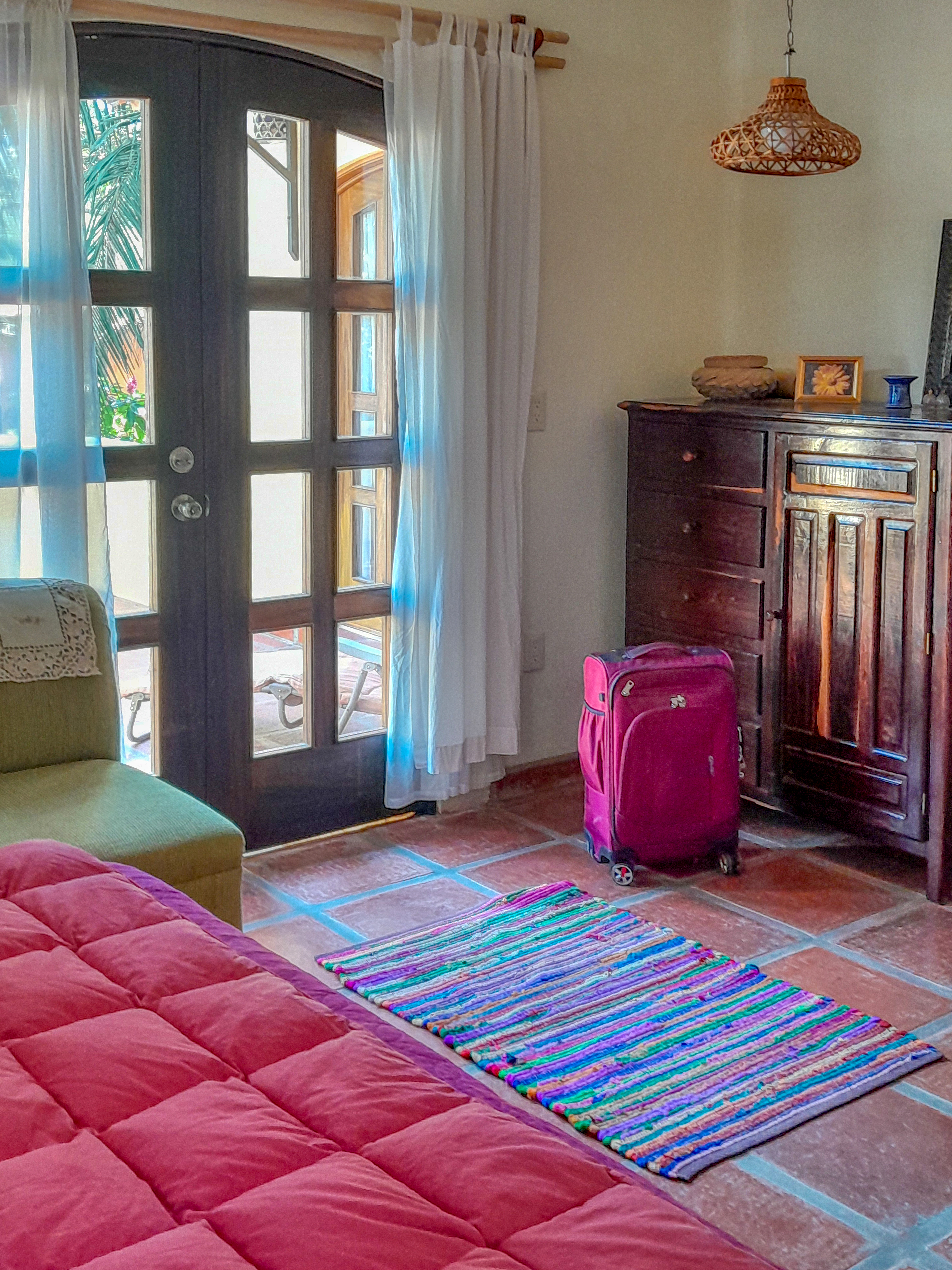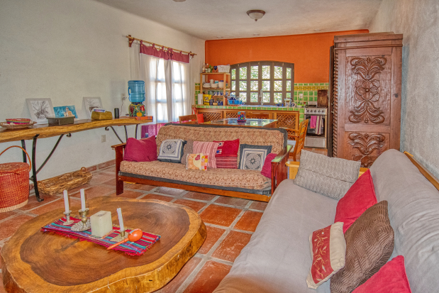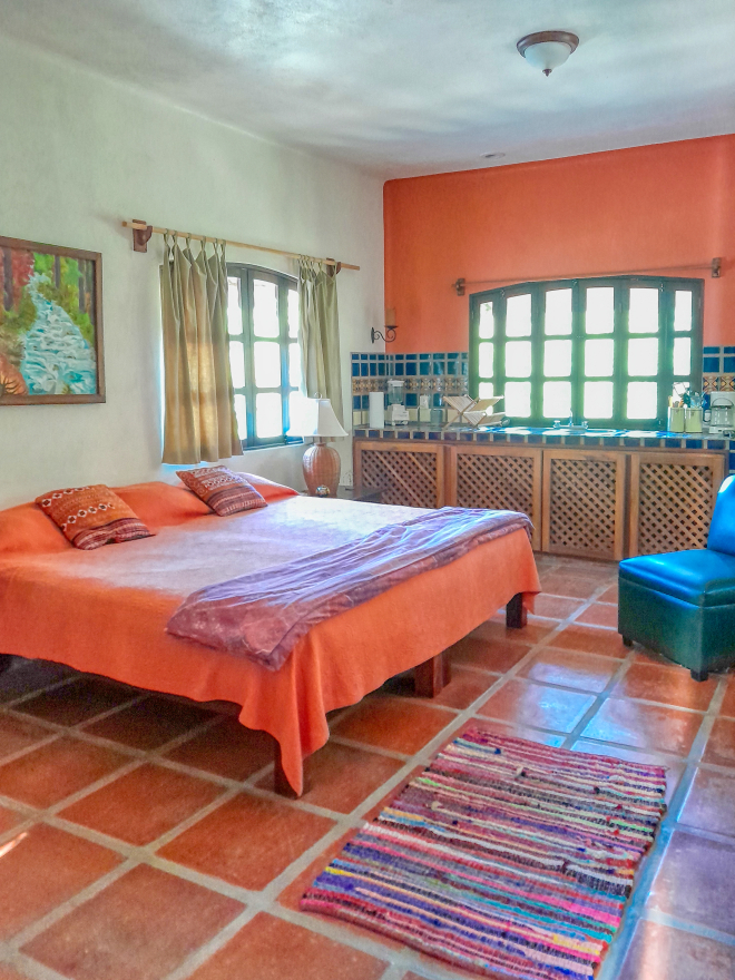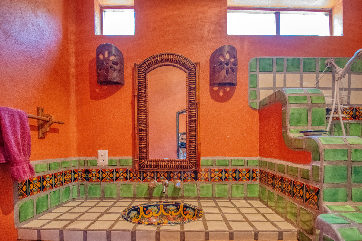 Returning inside through the other set of French doors, you'll find a spacious , well lit bedroom , graced additionally with a small cathedral window , protected by vine like ironwork . Circling back into the living room gives access to the bathroom , painted brilliant turquoise , with parota wood cabinet doors, as are all the doors of the casa . Herein the traditional Mexican shower is of white and blue tilework , detailed with design azulejos ; an incentive to sing in the shower !