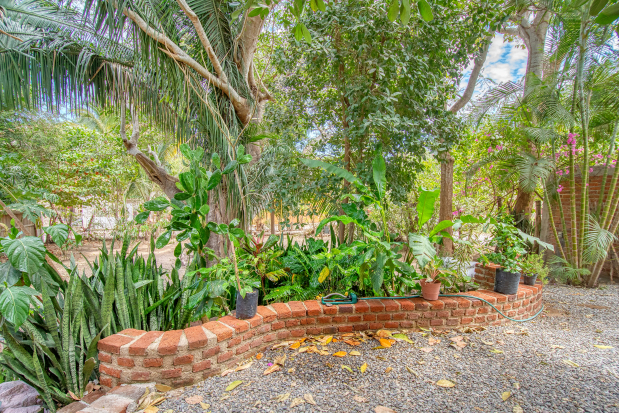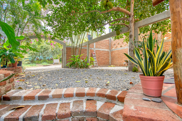 The porch for the staircase is shared with the first floor entry. Enjoying your morning coffee on this porch , you might look out into the tall brick walled courtyard , up to the huge jackfruit hanging from the tree , or down onto the tiered rock jungle garden descending to the base of the Higuera and Palm trees, or you might prefer the private patio , accessible through the set of arched French doors from the kitchen area of the first floor dwelling . This also looks out on the junglesque environment , as do all the windows of the house . Also present on this almost double sized property is a plethora of other trees : Tamarindo , Almendra , Bamboo , Guayaba , Neem , Jack Fruit , Moringas , Capulins , Primaveras, and Palms .