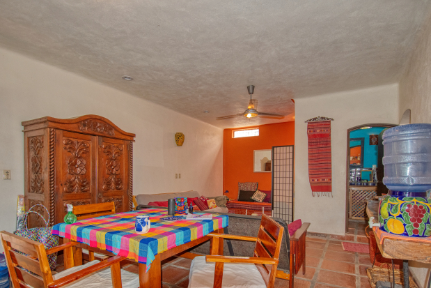 Approaching Casa Topacio you'll know you've arrived when you get to a fence line of multicolored bougainvilleas leading to the arched entrada of Casa Topacio .Passing through the archway , you'll no doubt notice the imposing Higuera , a wild fig tree , supporting enormous palapa fronds of the palm that it grew from as many as 150 years ago . Looking forward , the three story Casa Topacio , painted a brilliant yellow , stands before you . You'll see the sheltered outdoor staircase leading to the second floor, making Casa Topacio ideal as a single family home, with possibly two cooks in the family , or as a rental , the owner living in one part and renting the other , or renting both parts.